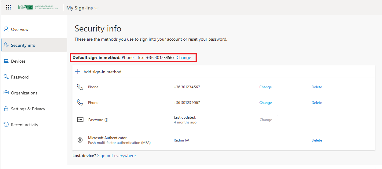 1. Log in at https://myaccount.microsoft.com with your MATE ID (ending with @uni-mate.hu, e.g. Abc1234@uni-mate.hu) and the password you set on the JoKeR site. If you logged in successfully, click on the Security info menu.
