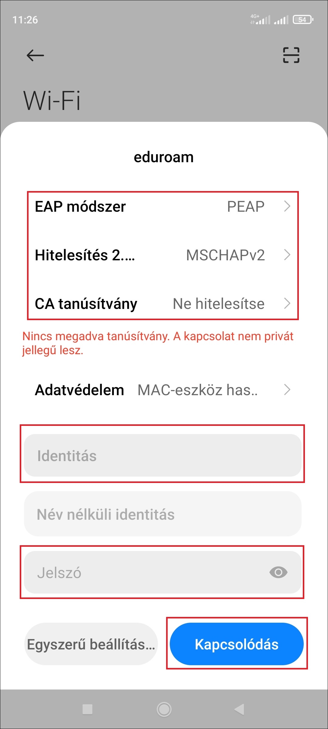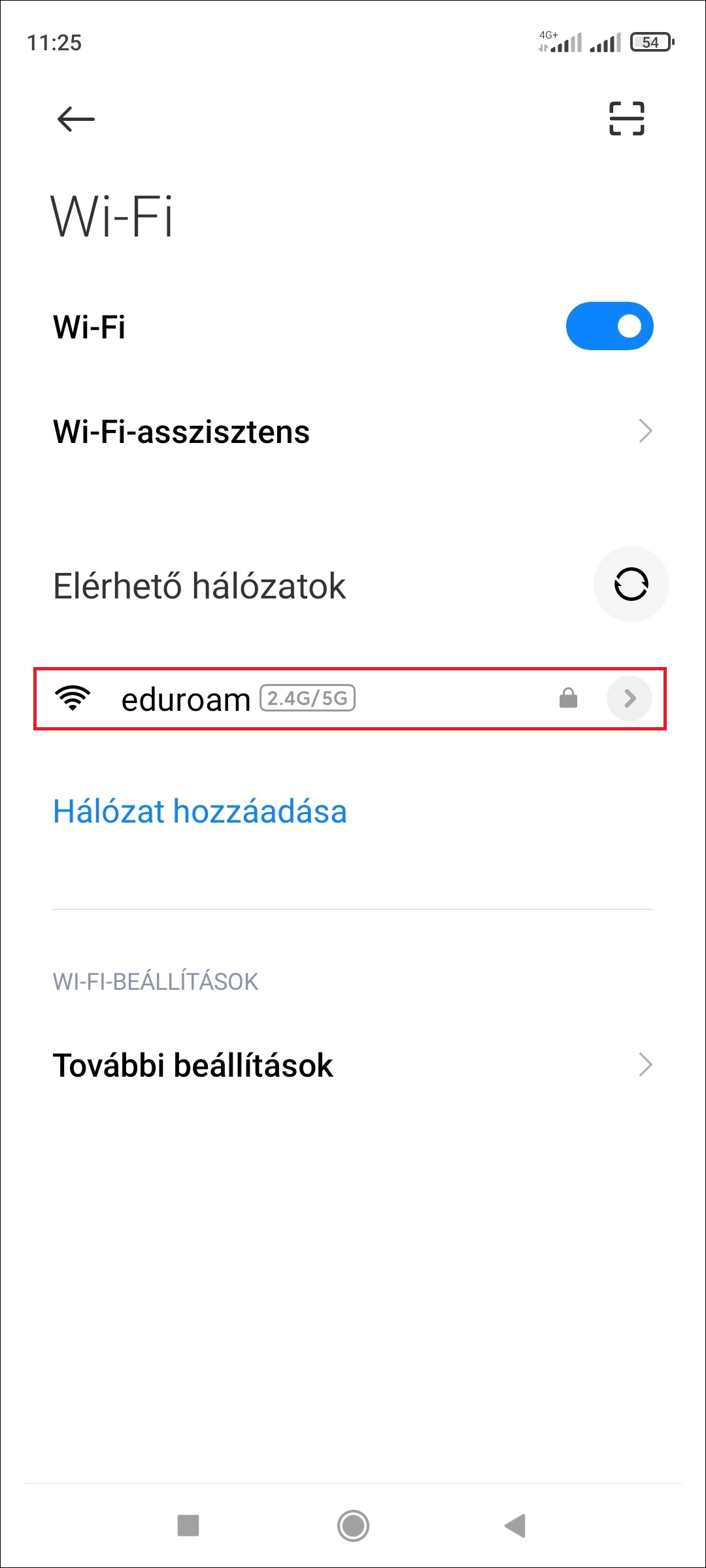 5. Amennyiben mindent megfelelően csinált, pár másodperc után, a készülék kijelzi, hogy Csatlakozva van az eduroam Wi-fi-hez.