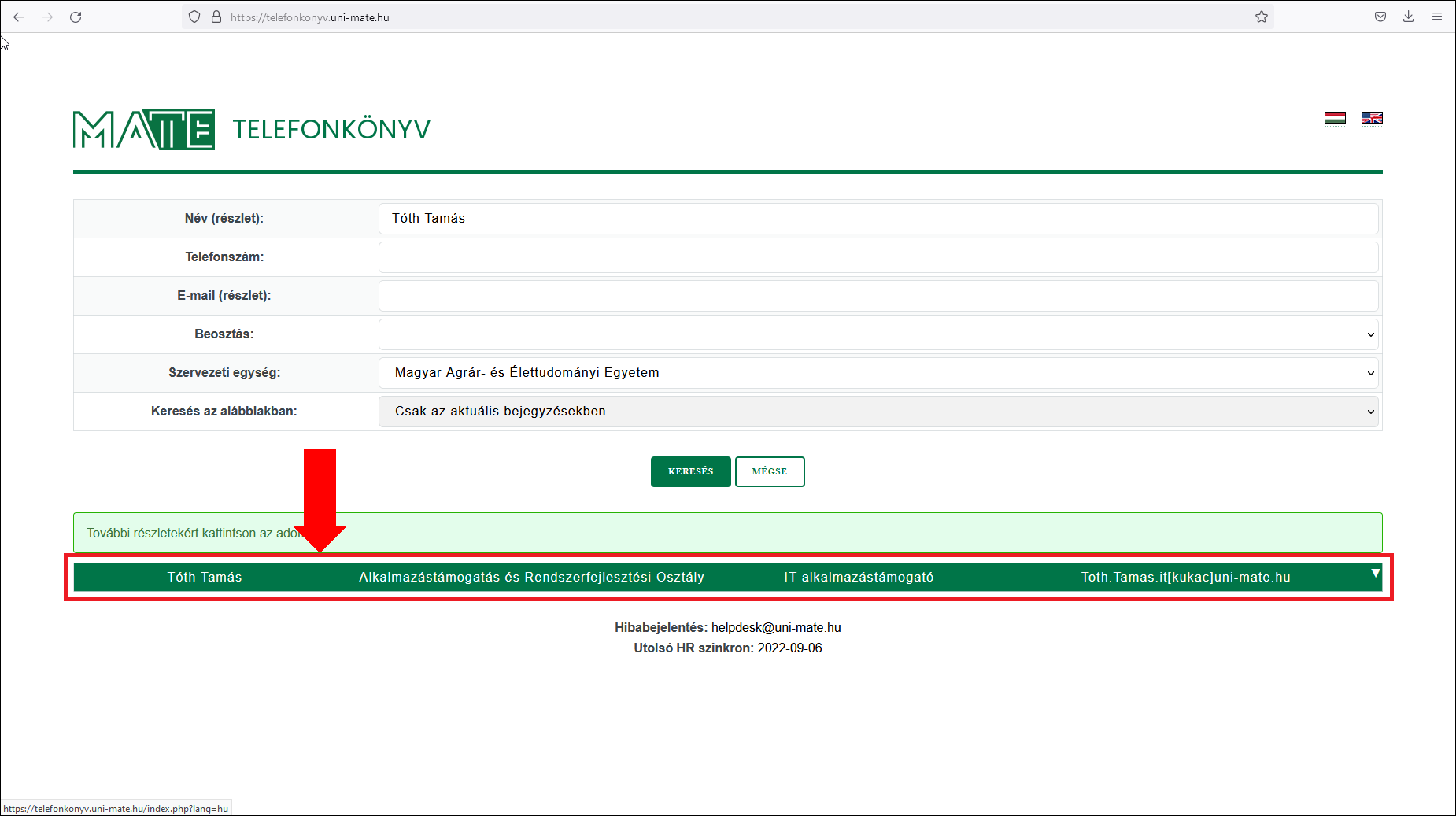 Amennyiben az ön adatai már regisztrálva vannak a telefonkönyvben, a keresésre kattintva megjelenik egy mező az ön nevével, szervezeti egységével, beosztásával és e-mail címével. Kattintson rá a mezőre.