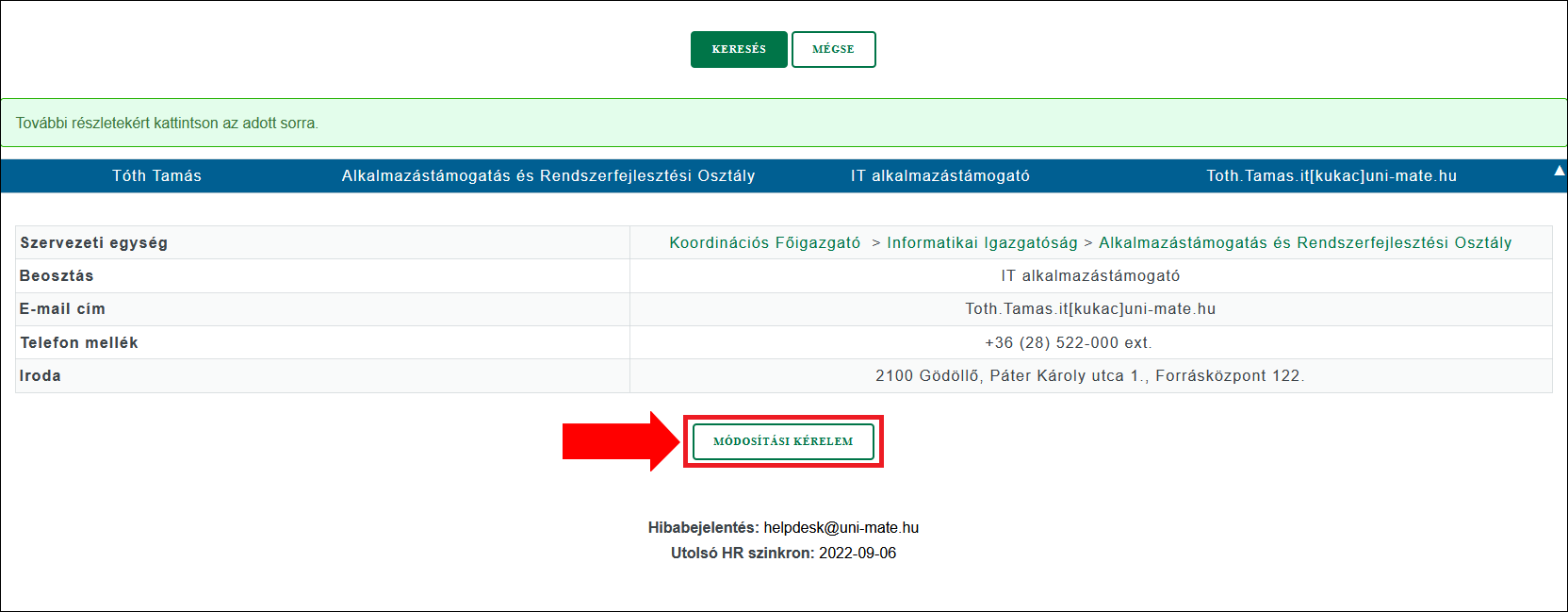 A lenyíló területen további részleteket találhat a kontaktjáról. Kattintson a Módosítási Kérelem gombra.