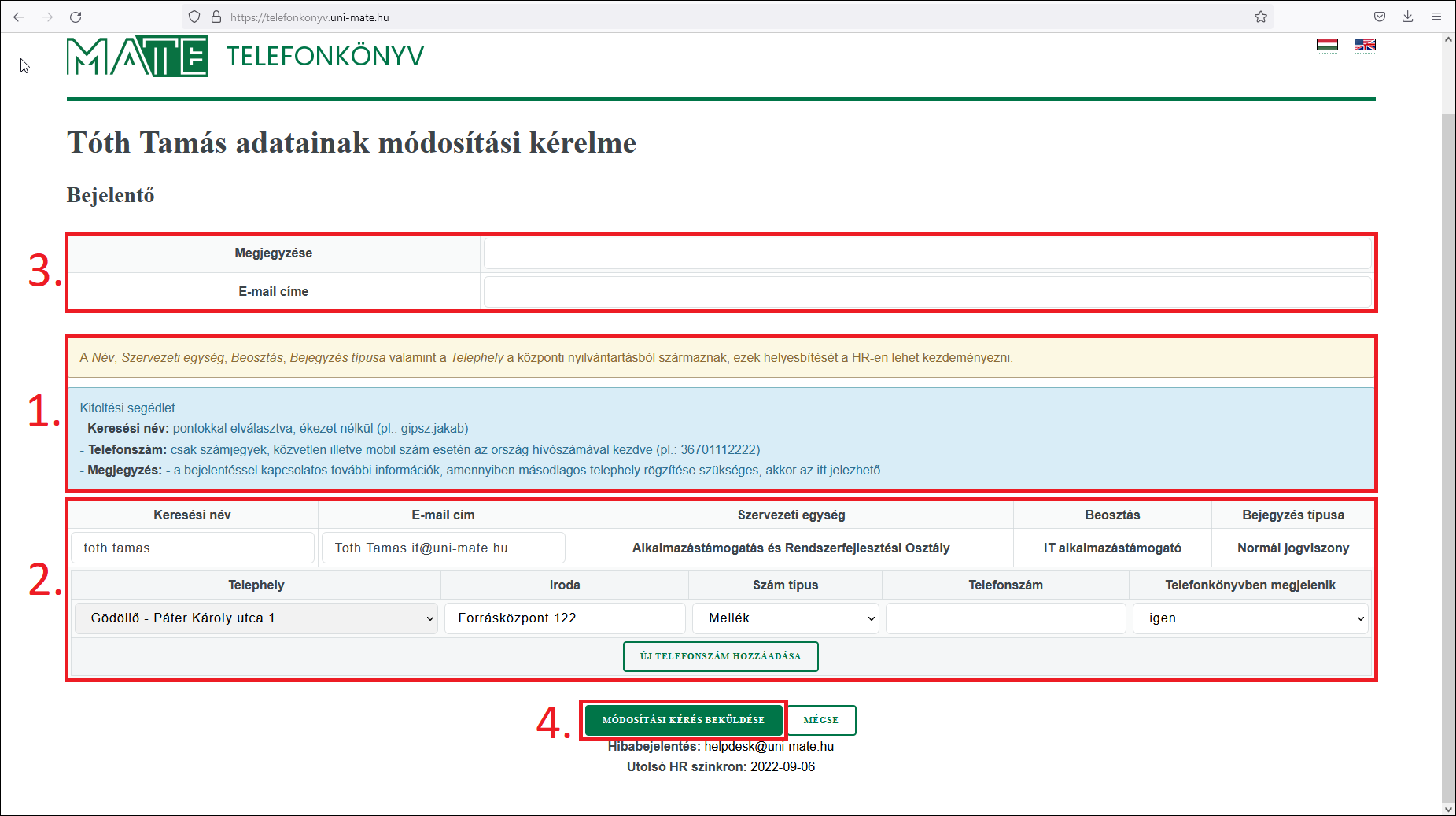 Módosítások végeztével a 3. pontban található területen adja meg az e-mail címét és a megjegyzésben részletezzük a módosítási kérelem leadásának okát, majd a 4. pontban található Módosítási kérés beküldése gombbal véglegesítjük a kérelmünket.