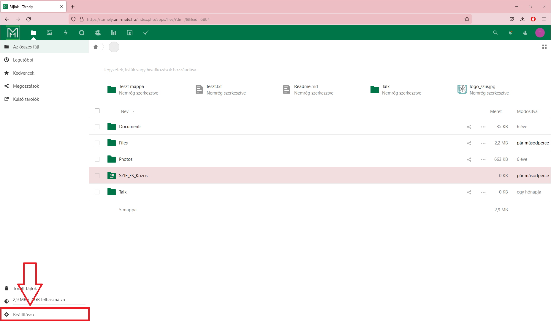 1. A tárhely oldalra bejelentkezve a bal alsó sarokban kattintsunk a Beállítások gombra.