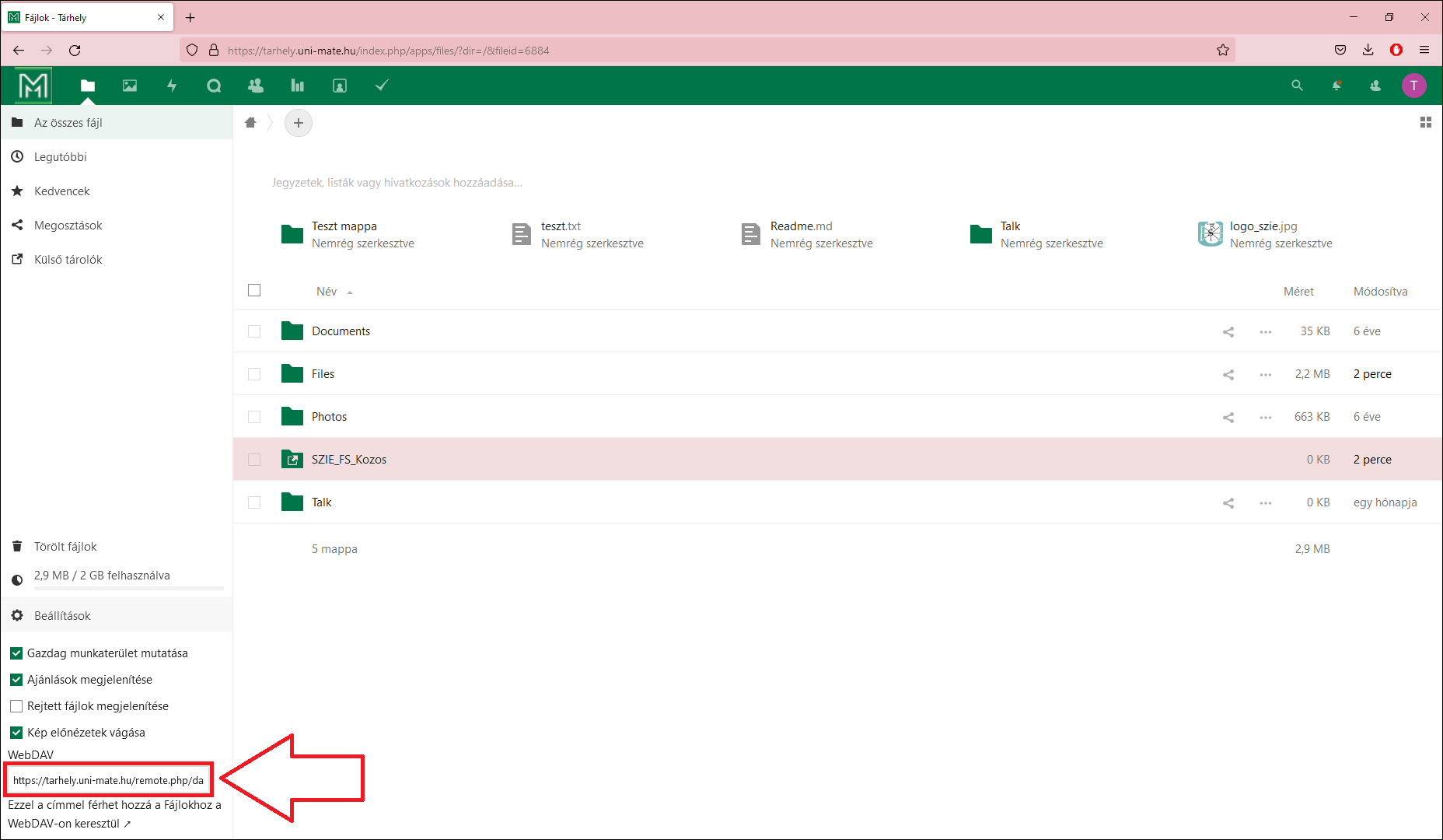 6. Amennyiben jelszavunk naprakész, és a hitelesítés sikeresen megörtént, a Hálózati helyek fül alatt máris megjelenik a tárhelyünk tartalma.