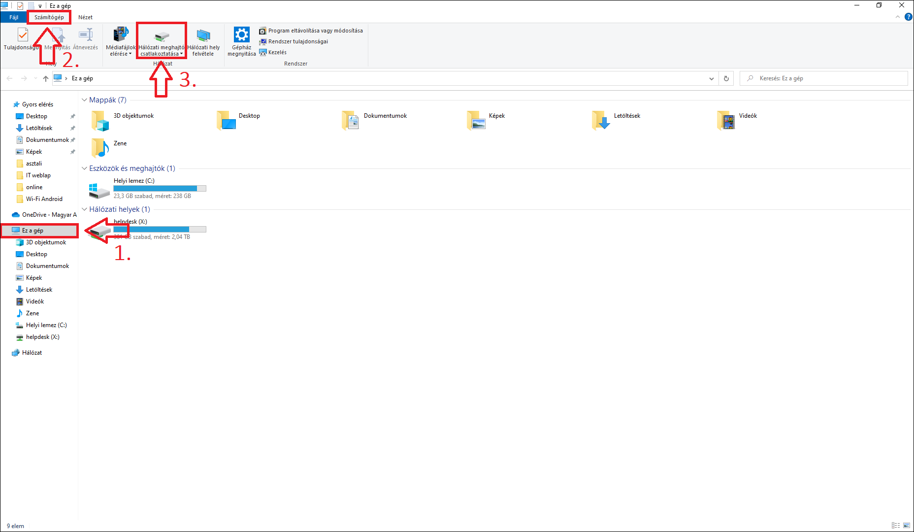 3. Számítógépünkön nyissuk meg a Fájl kezelőt, majd a képen látható 1. pont szerint kattintsunk az Ez a gép menüpontra, majd a 2. ponton jelölt Számítógép menüpontra, és ezek után a 3. ponttal jelölt lenyíló területen a Hálózati meghajtó felcsatolása gombra.