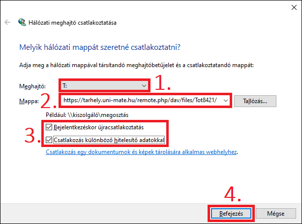 4. A megjelenő ablakban, először adjuk meg tetszőlegesen a meghajtó betüjelét, majd a 2. ponttal jelölt területre illesszük be a korábban kimásolt hivatkozás szövegét. Jelöljük be, hogy bejelentkezéskor csatlakozzon újra ez a hálózati meghajtó, és a csatlakozás különböző hitelesítő adatokkal pontot is pipáljuk ki. Ez után nyomjunk a Befejezésre.