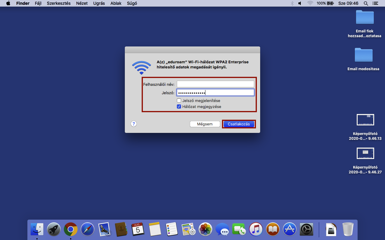 1. A képernyő jobb felső részén található Wi-fi ikonra kattintson, majd válassza ki az elérhető eduroam hálózatot.