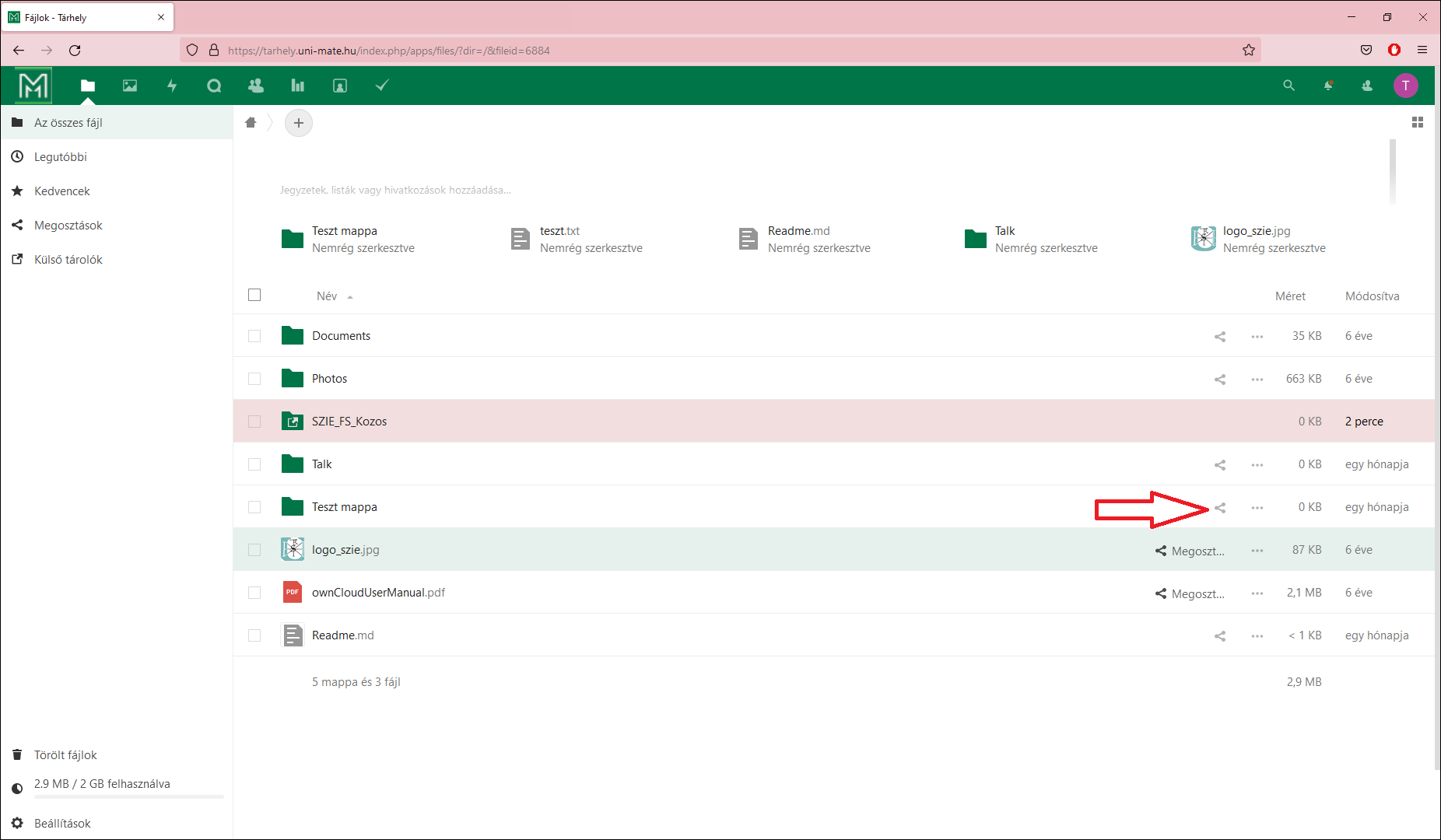 A MATE Tárhelyen lévő megosztott tartalmak mellett (3.pont) megosztást jelző ikon szerepel.