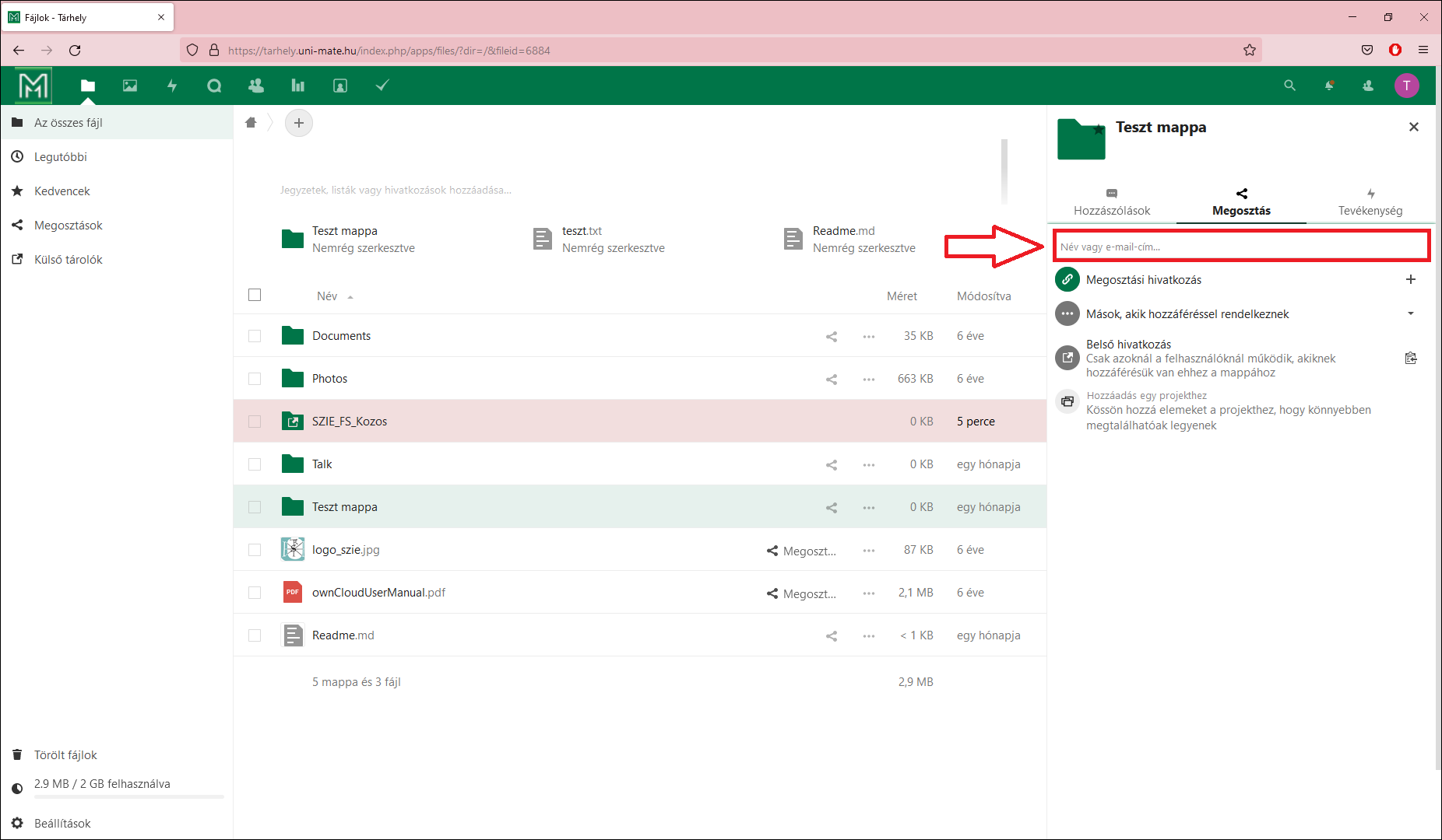 2. A megjelenő ablakban a Név vagy e-mail cím... mezőbe kezdje el gépelni annak a személynek vagy csoportnak az e-mail címét, akivel meg szeretné osztani az állományt. Belső(uni-mate.hu) és külső cím esetén is a teljes e-mail cím megadása szükséges.