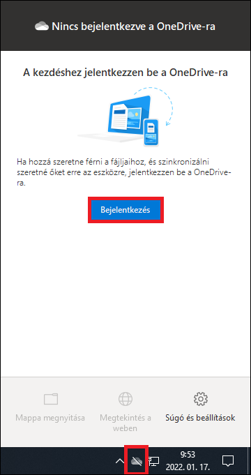 1. Kattintson a jobb alsó sarokban a OneDrive ikonjára, majd a felugró lapon kattintson a Bejelentkezés gombra. Ha nem találja az ikont, kattintson a felfelé mutató nyílra és ott keresse. Amennyiben nem találja a tálcán, írja be a OneDrive szót a Start menübe és válassza ki az alkalmazást.