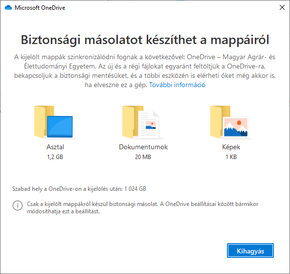 Amennyiben valamelyik mappa esetén biztonsági másolat készítését választja, annak tartalma felszinkronizálódik a OneDrive-ra. Ebben az esetben az adott mappa elérési útja is megváltozik, pl. a 4. pontban megadott elérési út \Dokumentumok-ra.