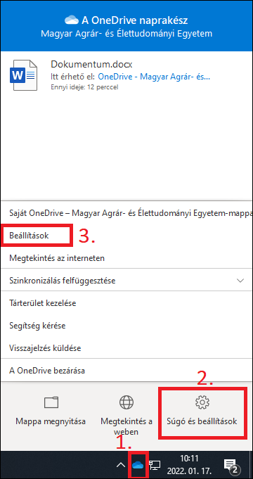 1. Kattintson a OneDrive ikonra, majd a Súgó és beállítások menün belül a Beállításokra.