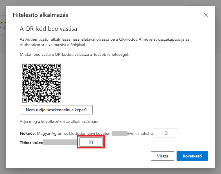 8. A következő ablakban kattintson a másolás gombra a titkos kulcs mellett.