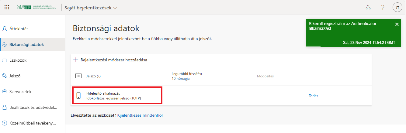 Amennyiben már nem fér hozzá az eszközhöz, vagy törölte a korábban beállított authenticator alkalmazást, kérjük jelezze a helpdesk@uni-mate.hu email címen és az IIG munkatársai eltávolítják a korábban megadott másodlagos hitelesítési módszert.