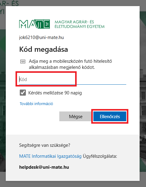 14. A kétfaktoros hitelesítés aktiválása után, továbbiakban amikor az egyetemen kívülről szeretne hozzáférni az M365 szolgáltatásokhoz (pl. Outlook levelezés), a böngészőprogramban meg kell adni a hitelesítő alkalmazásban látható kódot.