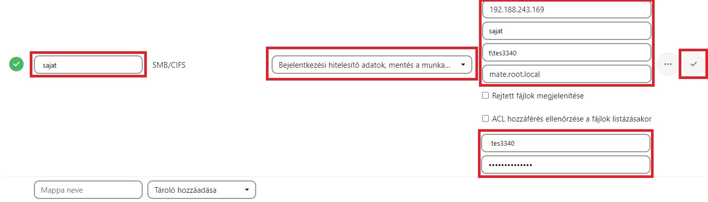 Domain: 192.188.243.169 Megosztás: sajat Távoli mappa (saját kezdőbetű és azonosító): pl.: t\tes3340 Domain: mate.root.local Felhasználónév (saját azonosító): pl.: tes3340 Jelszó: sajat - A bal felső sarokban lévő Fájlok ikonra kattintva tárhelyének alkönyvtárában láthatóvá válik a kívánt mappa.