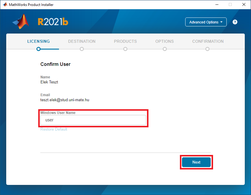 1. Indítsa el a letöltött telepítőkészletet. A megjelenő ablakban adja meg az egyetemi e-mail címét, amivel regisztrált és kattintson a Next gombra.